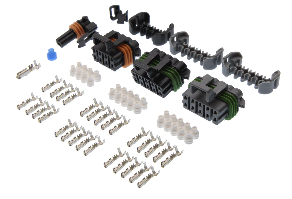 - Includes 4 Connectors, 4 terminal position assurance clips, 29 terminals and 29 seals.